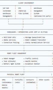 In approved SAP warehouse automation programs, SAP—often SAP Extended Warehouse Management—remains the central orchestration layer, while robotics platforms function as controlled execution components.